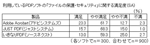 特に注目すべき点は、ファイルへの保護・セキュリティだろう。作成や編集、操作性と比べれば「満足」と答えたユーザーが少なかったものの、20%を超えている。特定の受け手にしか見せないようにするための閲覧制限やコピー・変更・印刷を制限するというPDFの強みを、Adobe Acrobatユーザーは高く評価しているということだ。