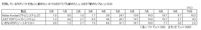 また、利用しているPDFソフトを他人に勧めたいかどうかを10点満点(10点が「とても勧めたい」、0点が「勧めたくない」)で聞いたところ、6点以上をみると、JUST PDFが56.4%、いきなりPDFが47.4%と約2人に1人が勧めたいと答えたのに対し、Adobe Acrobatは68.0%。実に、3人に2人以上という結果だ。使いやすいと感じているからこそ、他人にも使ってほしいということだろう。しかも、7~10点で答えた比率は、Adobe Acrobatが全ての他社製品を上回っている。