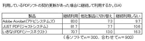 なお、利用しているPDFソフトの契約更新があった場合、継続して利用するかという問いについては、3社の製品とも「継続して利用する」との回答が圧倒的に多かった。その中でも、Adobe Acrobatの比率は高い。