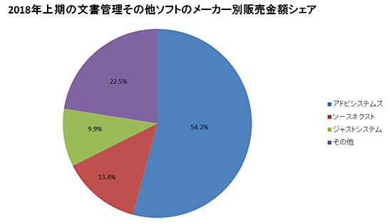 全国の家電量販店・ECサイトなどのPOSデータを収集している「BCNランキング」によれば、PDFソフトが含まれる文書管理その他ソフトのメーカー別販売金額シェアは、2018年上期(18年1~6月)の時点で、アドビシステムズが54.2%と半数を超えるシェアを誇り、ソースネクストが13.4%、ジャストシステムが9.9%などとなっている。