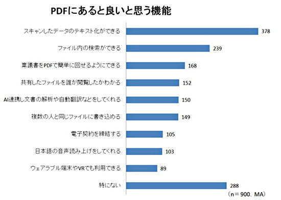 今回の調査では、PDFにあると良いと思う機能についても聞いている。その結果によると、「スキャンしたデータのテキスト化ができる」「ファイル内の検索ができる」などを望む回答が多かった。これらの機能を、Adobe Acrobat DCでは実現している。