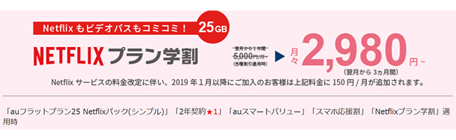 KDDIと沖縄セルラーは、「au」の学割キャンペーンとして、「auゼロ学割」「フラット学割20/30」「Netflixプラン学割」「auフラットプラン5(学割専用)」を提供する。期間は12月1日~2019年5月31日。