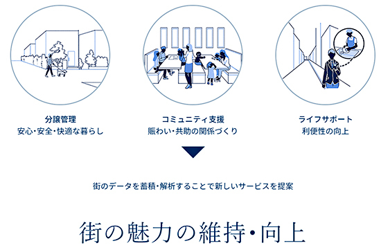「NiSUMU」は、各住戸や分譲地内にスマートセンサー、スマート街灯といったIoTデバイス/センシングデバイスを設置し、新しいまちづくりをテクノロジーで支えるプラットフォームとして開発。業務管理機能、総会/理事会開催補助、共用設備予約、スマート回覧板といった分譲管理機能に加え、スマートセキュリティ、スマートコミュニティ・スマートコンシェルジュをワンストップで提供。最新のIoTデバイスで収集したデータを活用し、住民の安心・安全やコミュニティの活性化、まちの魅力の維持・向上につなげる。