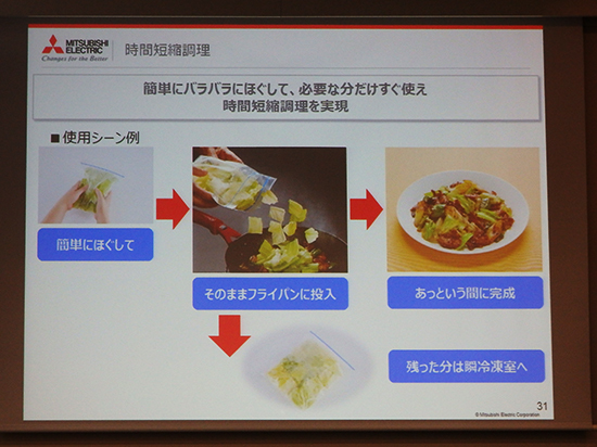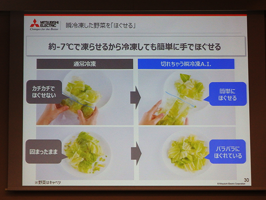 三菱の独自技術である瞬冷凍は、食品全体にきめ細かい氷結晶を一瞬にして形成することで、芯から均一に凍らせることができる。食材の細胞破壊も抑えられるので、カット野菜も生のまま冷凍できるようになり、シャキシャキした食感も得られるという。