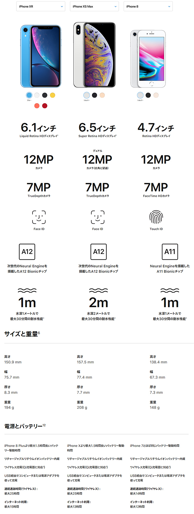 防水・防じん性能は、「iPhone XR」では引き続きIP67等級だが、「iPhone XS Max/XS」のみ、最大水深2メートルで30分間まで耐えられるIP68等級に向上。次世代のNeural Engineを搭載したA12 Bionicチップ、顔認証やセルフィー撮影に効果を発揮するTrueDepthカメラシステムなど、その他はおおむね共通となっている。