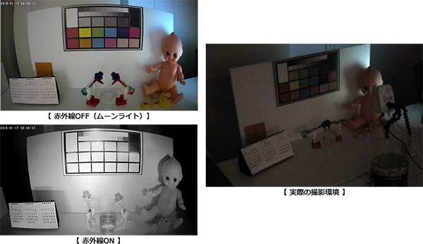 Sony製高感度CMOSセンサー「IMX323」を搭載しており、「ムーンライト機能」として、0.1ルクス(月明かり程度)の照明下でカラー撮影が可能。赤外線暗視機能を使わなくても常夜灯(ナツメ球)程度の明るさでカラー撮影ができるため、夜間の赤ちゃんの様子やペットの行動を見守ることができる。街灯のある夜の住宅街は約1ルクスの明るさなので、自宅やオフィス周りの夜間監視にも活用できる。