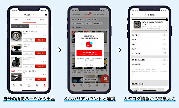 CARTUNEパーツ市場では、車のカスタムや整備、改造、DIY、ドレスアップ、パーツ取付などの情報を共有しながら、簡単に車パーツを売買できる。メルカリIDと連携し、アカウントを持っていれば簡単に利用することが可能。CARTUNEパーツ市場で出品すると、メルカリにも同時に出品され、同サービスを利用する月間1100万人のユーザーにもリーチできる。