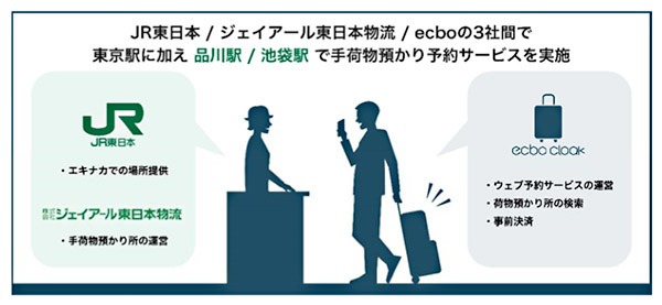 なお、JR東日本は2018年12月15日に、それまで「ecbo cloak」を導入していた東京駅に加え、品川駅と池袋駅でジェイアール東日本物流が運営する手荷物預かり所で「ecbo cloak」を導入し、国内外の旅行者に向けて、手ぶら観光の推進を図る。