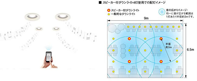 照明としては、LED「美ルック」(高演色Ra95)を搭載する。埋込穴の直径は、一般的なダウンライトと同じ100mm。一般的なダウンライトと、スピーカー付ダウンライトの親器と多灯用子器を組み合わせて設置すれば、広めのリビング、リビング・ダイニング・キッチン全体、店舗併用住宅はもちろん、カフェや美容院といった店舗でもマッチする。