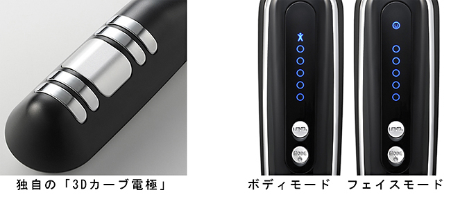 また、電極部は女性の曲線的なボディラインにフィットする独自の3Dカーブ電極を採用。腰回りやヒップにも効果的に働きかけ、体の全方位にケアを施すことができる。モードはボディ(エクサモード・セルケアモード)/フェイスの3種類。強弱は5段階調整。