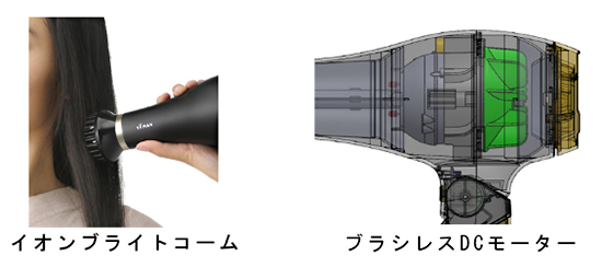 送風口に独自技術のモイスチャーパルスで髪表面のプラス・マイナスのイオンを密着させる「イオンブライトコーム」を新搭載。風を髪に直接当てながら乾かすことで、通常のドライヤーより艶となめらかさのある髪に仕上げる。「ブラシレスDCモーター」が、大風量で低温(60℃)の風を生むため、髪を傷めずに短時間で乾燥させることが可能。
