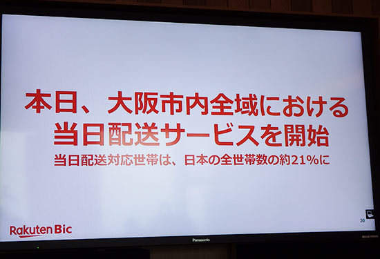 ビックカメラと楽天は4月17日、両社のショッピング会社「楽天ビック」が運営するECサイト「楽天ビック」が1周年を迎え、事業戦略発表会を開催、同日から大阪市内全域で当日配送サービスを開始したことを明らかにした。既に関東でスタートしている当日配送と合わせて、対応世帯は全世帯数の約21%をカバーする。