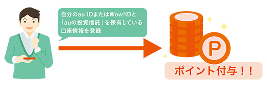 「auの投資信託ポイントプログラム」アカウント登録サイトで、自身の「au ID」または「Wow!ID」を登録し、「auの投資信託」を保有しているカブドットコム証券の証券口座情報を登録すると、月間平均保有残高に応じてポイント還元を受けられる。4月26日現在の対象運用商品は、auスマート・ベーシック(安定)/auスマート・ベーシック(安定成長)/auスマート・プライム(成長)/auスマート・プライム(高成長)の四つ。