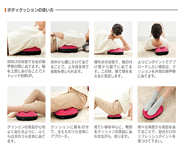 ハート型のの本体に肩・背中・腰・おしり・足といった、筋肉のハリなどが気になる部分を乗せるだけでストレッチをサポートする。体にフィットする大小4つの突起と心地よい振動がピンポイントにアプローチし、ストレッチ効率を高める。