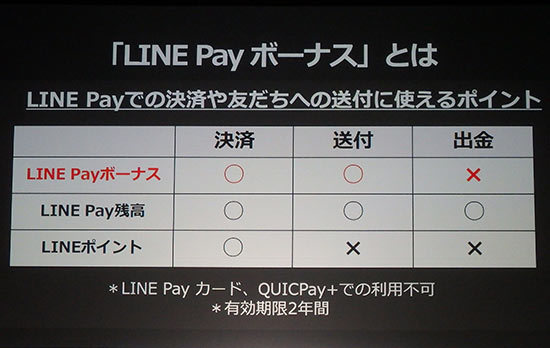 LINE Payボーナスは、従来のLINE Pay残高やLINEポイントと異なり、「決済」と「送金」ができるが、「出金」ができない。LINE pay残高は決済、送付、出金ができる。LINEポイントは決済のみで、送金と出金ができない。