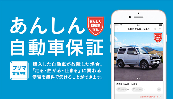 「メルカリあんしん自動車保証」では、メルカリアプリ(iOS版/Android版)から同保証の対象となる自動車を購入したユーザーに対し、メルカリでの取引完了後、3か月間「走る・曲がる・止まる」に関わる自動車修理を無料で受けられる保証を提供する。保証の上限金額は30万円。なお、事故や不正行為による故障は対象外。