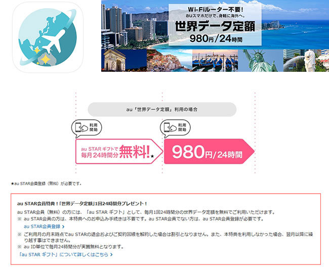 世界データ定額の場合、24時間当たり料金は980円。利用条件は、無料の「データチャージ」に加入していることで、日本で加入している定額サービス/料金プランの容量を消費するため、長期間の海外滞在でも通常のデータ容量を余らせずに済む。150以上の国・地域に対応しており、もちろんハワイなど米国も対象だ。