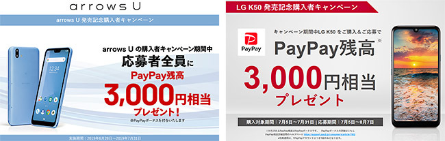 arrows UとLG K50の購入者を対象に、それぞれ富士通コネクテッドテクノロジーズ、LGエレクトロニクスの主催で、専用応募ページから応募すると、もれなく3000円相当の「PayPayボーナス」をプレゼントするキャンペーンを実施する。