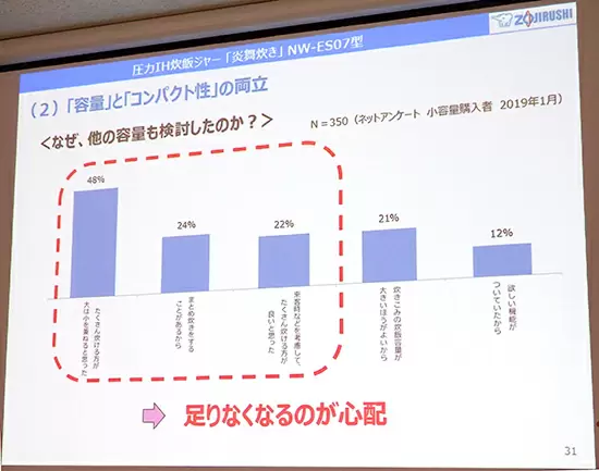 注目されている小容量炊飯ジャーだが、同社が調査した購入者のインターネットアンケートによると容量に不安を抱くユーザーの姿が明らかになった。普段は小容量だが、「来客時などを考慮したらたくさん炊ける方がいいと思った」(22%)や「まとめ炊きをすることがある」(24%)、「たくさん炊ける方が大は小を兼ねる」(48%)と回答したユーザーが多かったのだ。