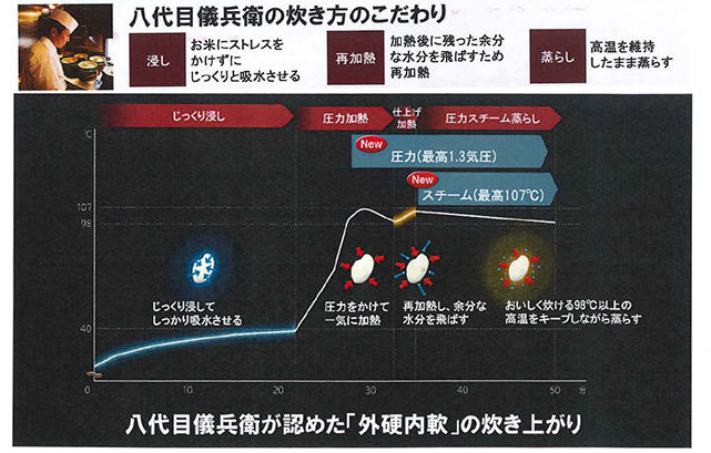 「先人はよく考えたもので、炊き上がったら最後の一藁を投入して火力を強める。ガス炊きの場合は10秒間、火力を強める」と橋本料理長が指摘するように、RZ-W100CMでも再加熱して余分な水分を飛ばす。そして蒸らし工程では、最高107℃の「圧力スチーム蒸らし」で98℃以上の高温を維持しながらじっくりと蒸らす。