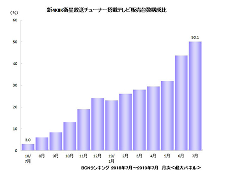 全国の主要家電量販店やネットショップからPCやデジタル家電などのPOSデータを集計する「BCNランキング」によると、新4K8K衛星放送チューナーを搭載したテレビの販売台数構成比は7月に50.1%と初めて5割を超えた。昨年7月の3.0%から、12月の本放送開始もあって急激に上昇している。