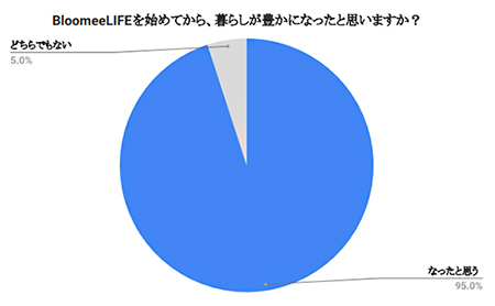 Crunch Styleがユーザーにこれまで花を買って飾る習慣があったかをたずねたところ、80%以上が「Bloomee LIFE」がきっかけになったと回答。さらに、95%以上のユーザーは、「Bloomee LIFE」を利用するようになってから生活が豊かになったと答えた。