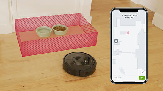 進入禁止エリアは、アプリ上のスマートマップに四角形のエリアを作れば、そこにロボットが入らないようになる機能。ユーザーは、ペットの水飲み場や花瓶、アート作品など、掃除させたくない場所を指定することができる。エリアを一度設定すれば変更しない限り有効なほか、複数の部屋にまたがることもできる。