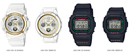 LOV-19Aは、ベースとしてアナログとデジタルのコンビネーションモデル「AW-591(G-SHOCK)」と「BGA-150(BABY-G)」を採用。文字板にヤドリギの木をモチーフにしたイラスト、インデックスにヤドリギの実をイメージしたゴールドのパーツをあしらっている。クリーンでピュアな印象のホワイトを基調としたボディに、ゴールドがきらめくデザインに仕上げている。