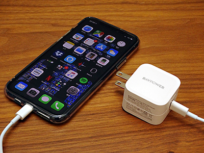 iPhone 11 Proをパッケージに付属するUSB Type-C充電器と、RAVPowerのRP-PC120とを交互に接続してバッテリーが10%回復するまでにかかる時間を確認してみたところ、およそ2分ほどRP-PC120の方が速くチャージできていた。なおiPhone 11 Proに付属する充電器の最大出力は18Wなので、底力の違いが充電時間の差として現れた格好だ。