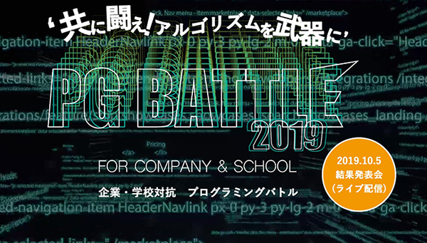 企業・学校対抗のプログラミングコンテスト「PG BATTLE 2019」が9月28日にオンラインで開催された。10月5日にライブ配信で結果が発表され、「企業の部」ではリクルートコミュニケーションズのチーム「PIGI BATTLE」が300点満点を獲得しての堂々の優勝だった。「大学・専門学校の部」では、東京大学のチーム「UT a.k.a ls」が300点満点を獲得して優勝。同じく300点満点の京都大学チームをタイム差で上回った。「高専・高校・中学・小学の部」では、麻布高等学校のチーム「AZB」が260点を獲得して優勝した。