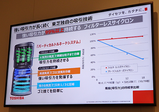 ほかにも、従来から採用しているフィルターレスのサイクロンシステム「バーティカルトルネード」もあらためて訴求する。サイクロンシステムには、プリーツフィルターでゴミを取る方法と、フィルターレスの方法の二つがある。