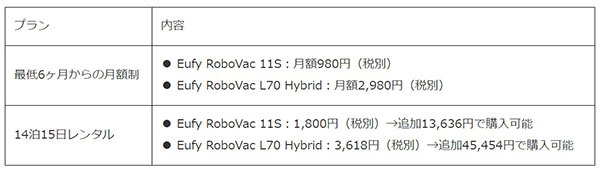 月額制プランの税別価格は、Eufy RoboVac 11Sが月額980円、Eufy RoboVac L70 Hybridが月額2980円。14泊15日レンタルプランは、Eufy RoboVac 11Sが1800円(追加1万3636円で購入可能)、Eufy RoboVac L70 Hybridが3618円(追加4万5454円で購入可能)。
