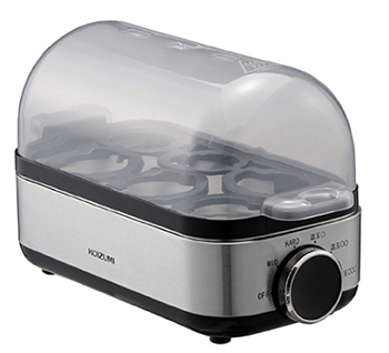 小泉成器はこのほど、本体の水受けに水を入れて市販の卵をセットするだけで、温泉卵や半熟卵、固ゆで卵など三種のゆで卵がつくれる「エッグスチーマー KES-0400/S」を発売した。価格はオープンで、税別の実勢価格は2980円前後の見込み。