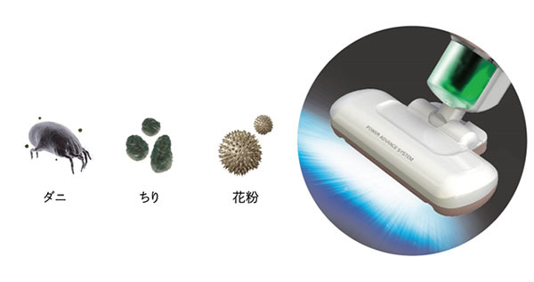 1万5000回/分のたたき回数は、たたきパットによる約7000回/分と高速回転ブラシによる約8000回/分のたたきによって実現した。これと、高速回転パワーブラシの2000回転/分が加わることで、ふとんなどの繊維の間に潜むゴミやダニ、花粉をしっかりとかき出して掃除する。