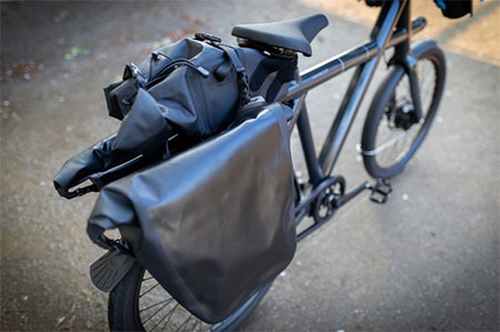 子供乗せ自転車としてもう一つこだわったのがバッグなどの積載用品だ。スーパーでのまとめ買いを想定するとどうしても車に軍配が上がってしまう。そこで、ある程度の容量を積載でき、かつマイバッグとしても利用できる「パニアバッグ」を選択した。VanMoofのリアキャリアは16mmチューブなので、大半のパニアが使える。この純正品以外にも各社から出ているので、自分好みのものを選ぶのもいいだろう。