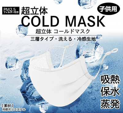 超立体COLD MASKは、冷感生地を採用し、マスクの蒸れから涼しく快適な着用感を実現したマスク。三層タイプの超立体型となっているため、マスクの機能はもとより、顔にピッタリとフィットする作りとなっている。吸熱、保水、蒸発に優れており、洗って何度も着用することができる。大人用サイズと子供用サイズの2型を用意している。