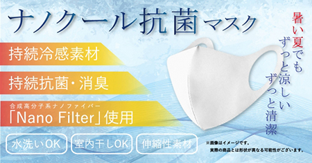 ナノクール抗菌マスクは、TERAXCOOL加工した生地を採用し、使ったそのときから冷感が持続する。TERAXCOOLは、接触冷感値(Q-max)が最大0.402。ポリシリコンと数種類の金属粉体をブレンドし、テラヘルツ波を放射する特殊加工によって放熱・遮熱の同時冷却を実現した高機能新素材となっている。