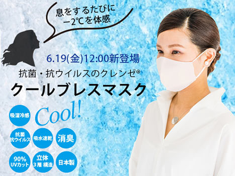 ヴィリーナジャパンは、真夏に向けて息をするたびにスーッとクールな-2℃を体感できる「抗菌・抗ウイルスのクレンゼ クールブレスマスク」を6月19日正午に発売する。価格は、大人用(オフホワイト・ライトグレー・ネイビー・ローズ)が2750円、子供用(オフホワイト・ネイビー)が2420円。