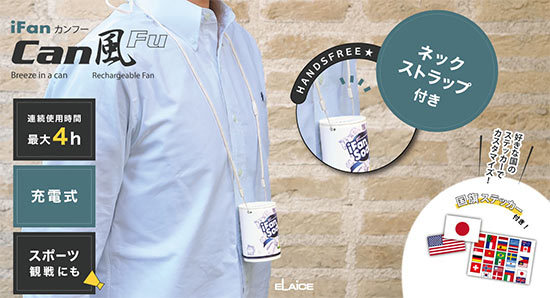 iFan CanFuは、ユニークな缶型を採用し、内部に小型ファンと充電池を内蔵。一見、扇風機と分からない外観ながら強力な風を送り出す。付属のネックストラップを使い、首から提げてハンズフリーでクールダウンが可能。人前でハンディファンを使うのに抵抗がある人にも、利用しやすくなっている。