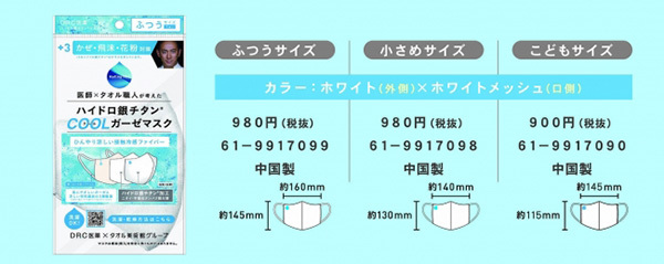 タオル美術館グループ・一広は6月30日、DR.C医薬と共同で開発した抗菌と冷感機能を備えたマスク「医師×タオル職人が考えたハイドロ銀チタンCOOLガーゼマスク」を全国の直営店「タオル美術館」で販売したと発表した。税別価格は、ふつうサイズと小さめサイズが980円、こどもサイズが900円。カラーはホワイトのみ。