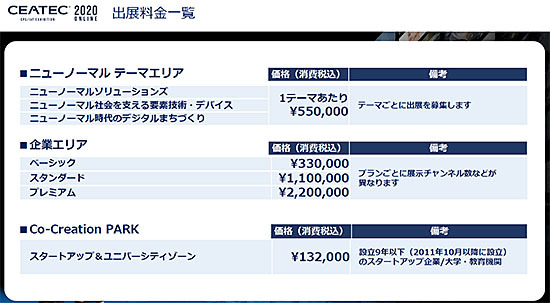 各エリアの出展料金も220万円~13万2000円まで用意し、従来の幕張メッセでのブース出展料よりも低く抑えることで、多くの企業の参加を募りたいとする。場所や時間、国内外にとらわれないというオンラインならではのメリットを生かす。さらに、コンテンツはイベントが終わった後も数カ月間、アーカイブとして閲覧、訪問できるようにするという。