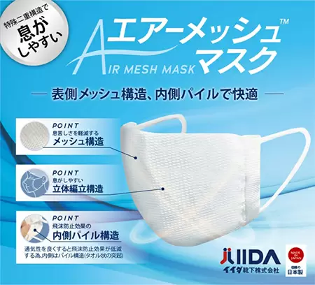 エアーメッシュ夏用ニットマスクは、呼吸が苦しいマスクの欠点を解消した2重構造ニットマスク。表側をメッシュ構造にして、呼吸が楽にできるようにした。また、口元側は、フラット面だが、通常の綿糸をさらに撚ることでシャリ感が出て、さらっとした肌触りになっている。2重構造内側にパイル面(タイル状)を配置することで、飛沫の飛び出しを軽減することができる。