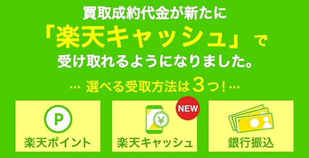 従来提供していた、指定口座を通じて買取代金を現金で受け取る「現金受取」と、楽天ポイントで受け取る「ポイント受取」に加え、買取代金の上限のない「楽天キャッシュ受取」を追加し、利便性を高める。