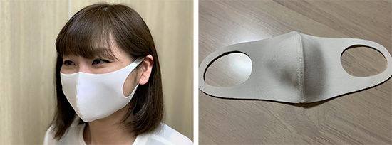 冷感マスクは、熱移動率0.297の接触冷感で、口元に布が付きにくい縫製を採用するとともに、一定の厚さを持つ生地との組み合わせによって、通気性の良さ、熱のこもりにくさ、清潔さを実現している。