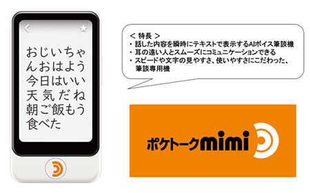 ポケトークmimiは、ボタンを押して話した内容を瞬時に大きな文字で表示するIoTデバイス。加齢性難聴の人や聴覚障がいのある人とのコミュニケーションをスムーズで快適なものにする。