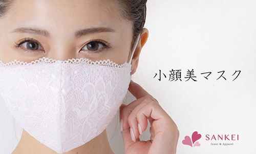 小顔美マスクは、楽天販売開始6分で2000枚を完売した、女性のための小顔に見えるマスク。一般的な使い捨てマスクに多いプリーツ加工をなくし、立体的な設計としている。頬から顎にかけて、V字になるようポイントをつくることで、マスクがしっかり顔にフィットし、シャープですっきりとした見た目を実現。着用するだけで小顔効果が実感できる。