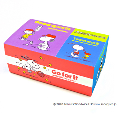 スヌーピー30枚入BOXマスクは、スヌーピーたちがスポーツを楽しむ「PEANUTS SPORTS」のポップでキュートなデザイン。部屋の中でもパッと華やかな印象を残し、インテリアとしても活用できる。箱は引出タイプになっており、マスクを取り出すたびに、内箱にデザインされたスヌーピーを楽しむことができる。マスクは、持ち運びに便利な個別包装となっている。