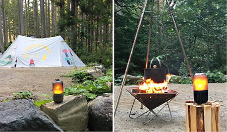 ゆらぎカプセルスピーカーは、灯りをともすランタンとお気に入りの音楽を流すスピーカーの2つの機能をあわせもち、さらに炎のゆらぎのような灯りを持ち運ぶことで、どこででも癒しのひと時を過ごすことができるカプセル。