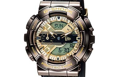 ベースモデルに、金属製のベゼルが特徴のGM-100を採用。カラーは、ニューエラの象徴的なアイテムである59FIFTYのバイザーステッカーからインスパイアされたゴールドとブラックを基調にする。