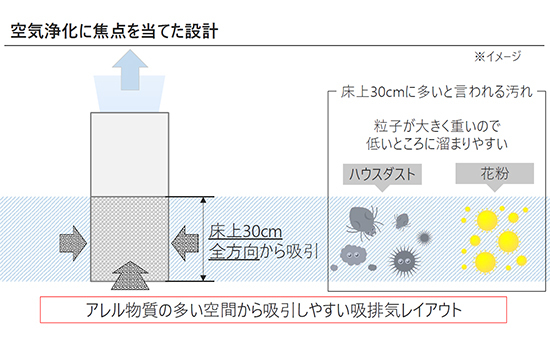 PU-AA50型は従来の構造を根本から見直して、花粉やハウスダストが多いとされる床上30センチの本体部分に、360度取り巻くように大面積の高性能フィルターをレイアウト。本体上部からきれいな空気を天井に向けて吹き出す構造にした。